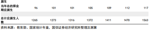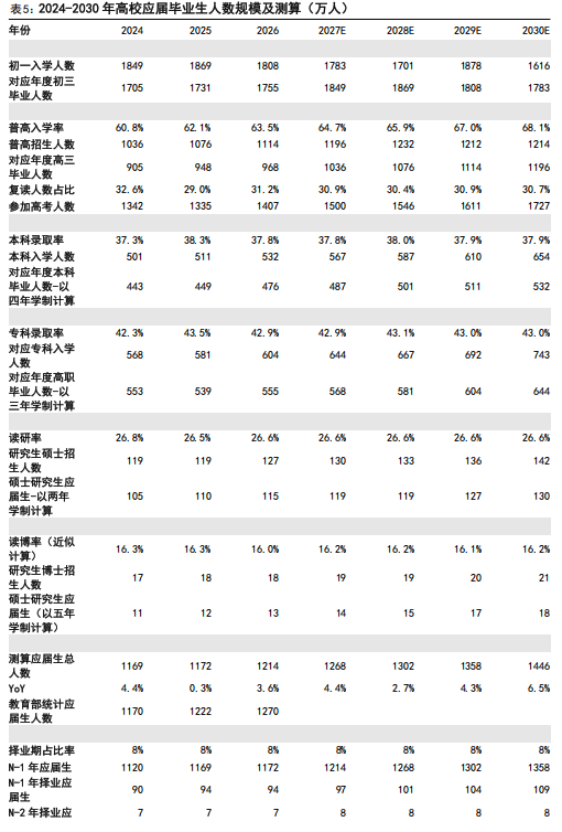 估计每年应届高校结业生人数必然程度上可按照适龄生齿规模及升学率进行测算得出,此外教育部此前年度均有发布应届结业生人数数据,能够此为参考查验测算的精确性。我们对高校应届结业生的具体测算如下表所示,2024-2026年间相关测算成果取教育部发布的应届结业生人数误差均正在5%以内,我们认为该测算方式所得结论具有必然的可托度。环节假设包罗:①初一入学人数对应为昔时适龄生齿数(权利教育阶段毛入学率估计正在100%及以上);②十五五规划提出扩大通俗高中资本,鞭策高档教育提质扩容,扩大优良本科教育招生规模,估计通俗高中及高档教育将进一步普及。假设每年因就业布局性矛盾或小我自从见愿而暂未落实就业单元的择业期学生人数占当届学生人数的比例约8%,则经测算每年的择业期应届生人数约正在100-140万人量级。