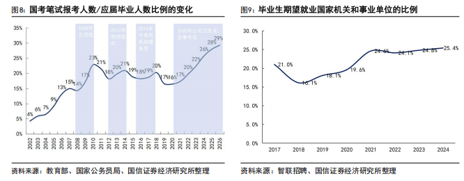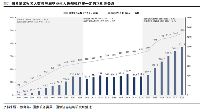 我们据华图教育等机构数据,统计了2002年至2026年国考笔试报名人数。具体如下图所示,国考报名人数可分为三个较着阶段。2002-2010年间,国考报名人数处于高速增加阶段,复合年增加率(CAGR)达到48。2%。这一期间,伴跟着应届结业生人数的走高,越来越多的人选择加入国考,寻求不变的职业成长机遇,应届结业生人数的增加为报名人数的攀升供给了复杂的潜正在群体根本。2011-2020年,应届结业生人数增速显著下滑,国考报名人数也进入到相对平稳的增加阶段,复合年增加率降至0。2%。而2021-2026年,应届结业生人数再度快速增加,国考报名人数再次呈现较为较着的上升趋向。