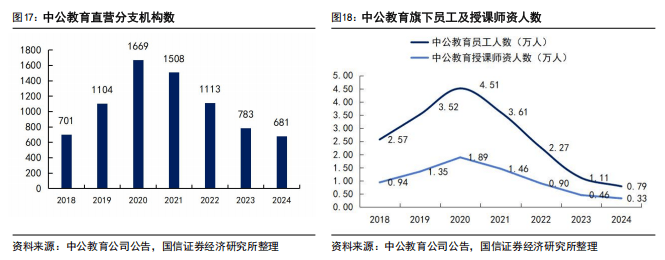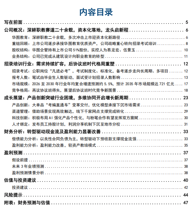 上市公司衔接华图教育优良资产,转型聚焦应考培训,2024年营收已超越中公教育成为行业第一。华图教育深耕职教二十余载,是国内最早的应考培训机构之一,于2019-2021年对上市公司进行股权收购、办理层更替,2023通过无偿授权华图教育无形资产,逐渐完成资产整合取实控人变动。公司至此转型聚焦以面授为从的招录培训营业。转型后收入业绩大幅改善,2025年前三季度实现营收24。6亿元,实现归母净利润2。49亿元。