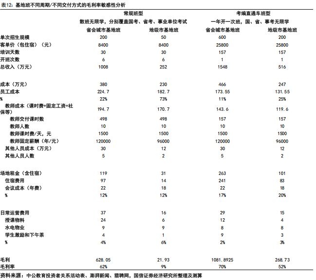 对于班而言,教师和场地相关的固定成本较大,运营杠杆较为显著,开设班要肄业生规模达到必然门槛并连结不变。另一方面,考虑到测验排期以及分歧科目可能报考人数纷歧,班的操纵率会存正在较着的波动,考虑到机构结构班租期较长,越持久的班型越能不变操纵率进而提高毛利率。因而班这一可以或许提拔学生进修结果的产物,焦点所需要处理的问题是“若何实现将学生规模持久不变正在必然数量”。