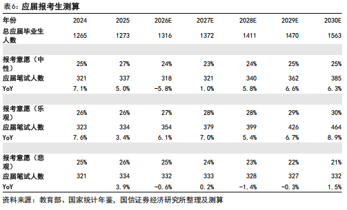 中性报考志愿(取前六年的平均值)下,应届笔试人数从2024年的321万人添加到2030年的385万人;乐不雅报考志愿(假设报考志愿进一步上升),应届笔试人数从323万人添加到464万人;悲不雅假设下(假设报考志愿逐渐下滑至疫情出息度),报考人数先增高后回落至332万。考虑到应届生人数添加必然程度也会形成就业合作加剧,我们看好中期报考志愿仍将维持高位并提拔。