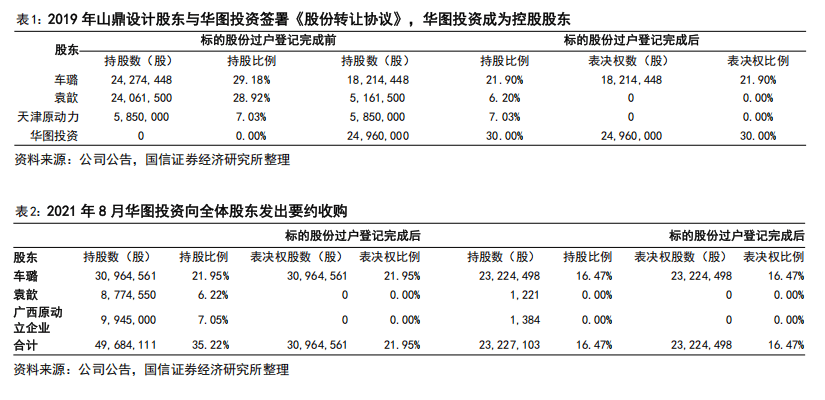 2019年9月,山鼎设想(华图山鼎前身)控股股东、现实节制人车璐、袁歆取华图投资签订了《股份让渡和谈》,华图投资拟以现金对价7。50亿元(30。05元/股)受让前者30%股权,让渡完成后车璐、袁歆持股比例降为35。13%,同时袁歆、天津原动力放弃上市公司13。23%股份的表决权(华图投资表决权为30。00%、原实控人表决权比例降为21。90%);同年11月股权过户完毕,华图投资成为控股股东,易定宏、伍景成全为上市公司实控人;2020年5月公司简称更改为“华图山鼎”;2021年8月,控股股东华图投资全体股东发出要约收购,拟以48。32元/股收购2922万股;2021年10月要约收购完成,控股权占比提拔至51%,同时车璐、袁歆及原动立持股比例降为16。47%(对应表决权占比为16。47%)。