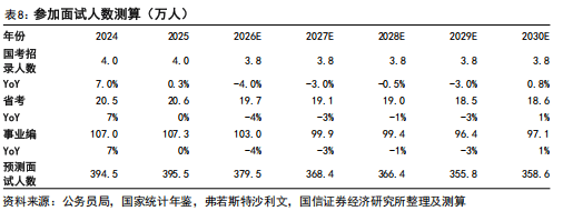 我们进一步对公考面试人数进行阐发。公考面试比例一般基于岗亭报考的抢手程度而设定分歧的入面比例,一般而言最为常见的入面比例为3!1,即面试人数是打算招录人数的三倍,因而面试人数取招录打算数存正在亲近关系。国考招录人数我们根据公事员局同一统计数据,省考我们按照各省市发布的招录打算进行汇总,事业单元招录人数数据参考人社部发布的2023年事业成长统计公报,全年全国公开聘请事业单元工做人员97。5万人,我们假设2024-2025年聘请人数正在100万级别人数。瞻望后续,因为延迟退休布景下,编制腾退不脚,我们估计后续年份招录打算将面对波动缩减,进而导致面试人数下滑。