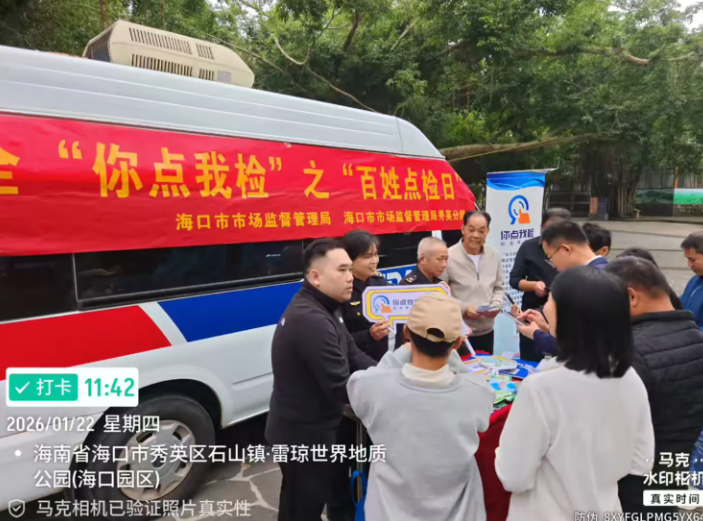 春节前夜,为进一步提拔食物抽检工做参取度,加强人平易近群众对年货食物平安的获得感和对劲度,营制食物平安社会共治共享款式,2026年1月22日,海口市市场监视办理局正在区火山口地质公园开展年货购食物平安“你点我检”之“苍生点检日”宣传勾当。让市平易近群众点选出本人关怀关心的节日食物品种、场合和查验项目。
