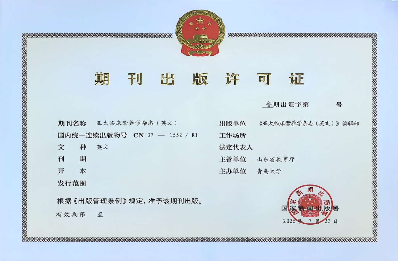 近日,由期刊社牵头组织申请的《亚太临床养分学杂志(英文)》(Asia Pacific Journal of Clinical Nutrition, APJCN) 正式获得国度旧事出书署关于开办期刊的批复。《亚太临床养分学杂志(英文)》期刊国内统连续续出书物号为(CN号):CN37-1552/R1,英文版,双月刊,从管单元为教育厅,从办单元为青岛大学。此次获批,标记着《亚太临床养分学杂志(英文)》的办刊成效获得承认,